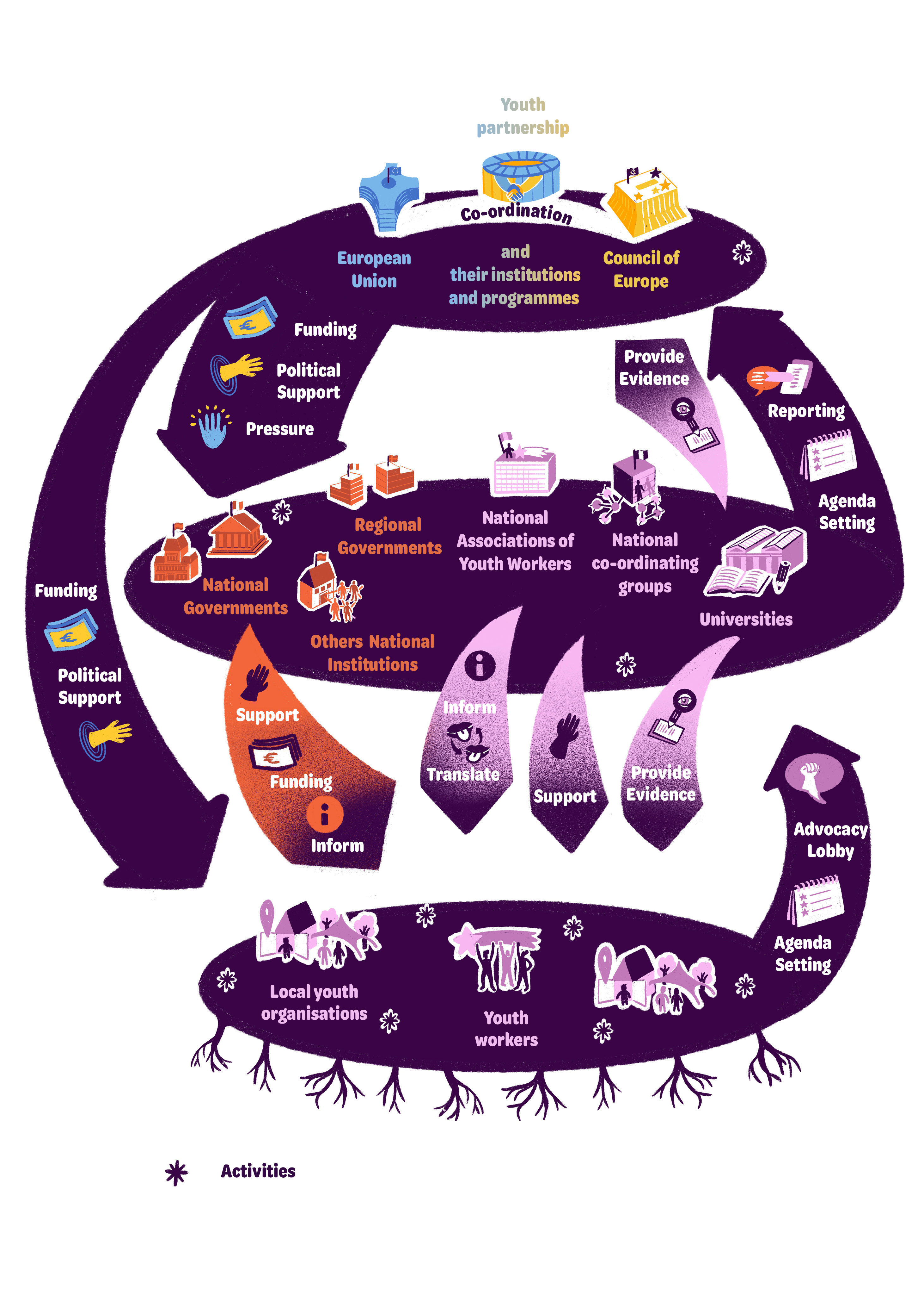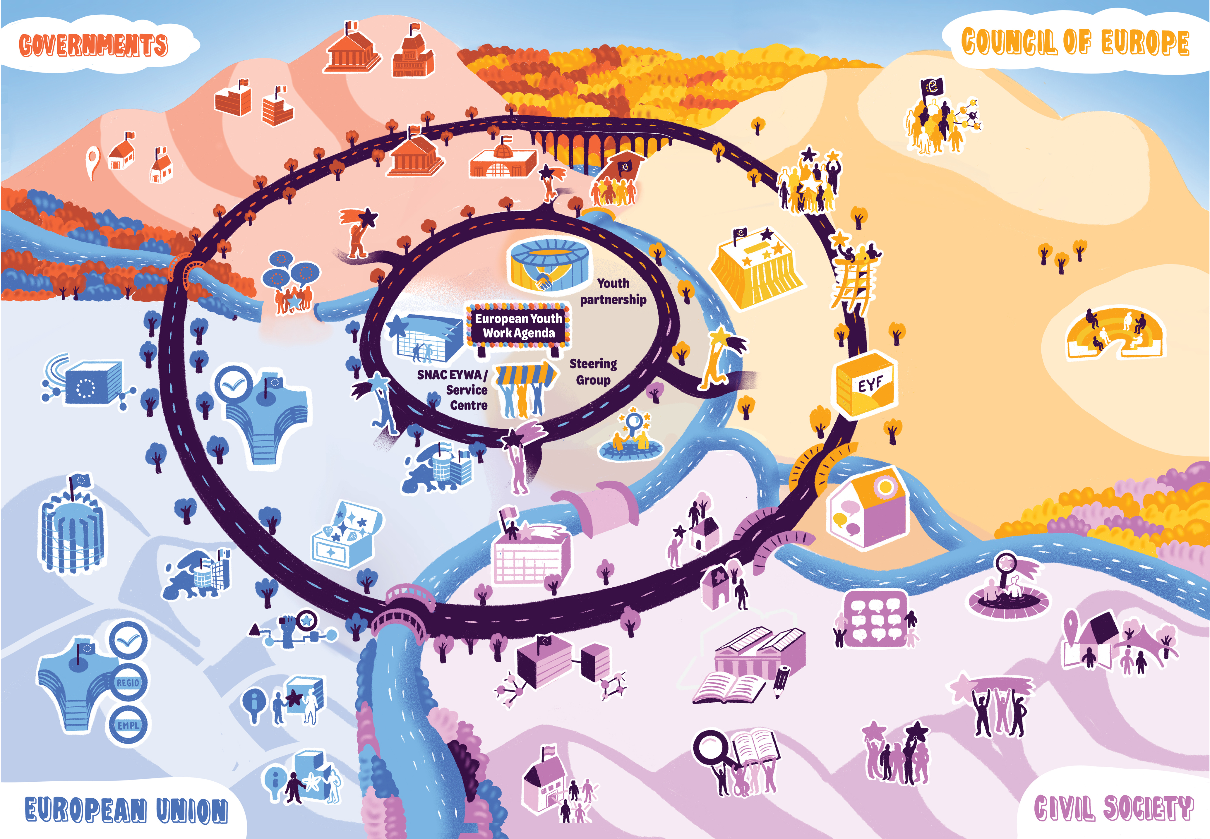 Figure 1: The European youth work ecosystem (illustration by Coline Robin, see Atanasov and Hofmann-van de Poll 2024: 28)